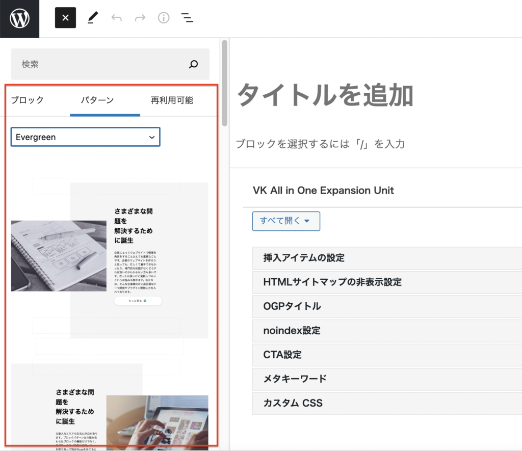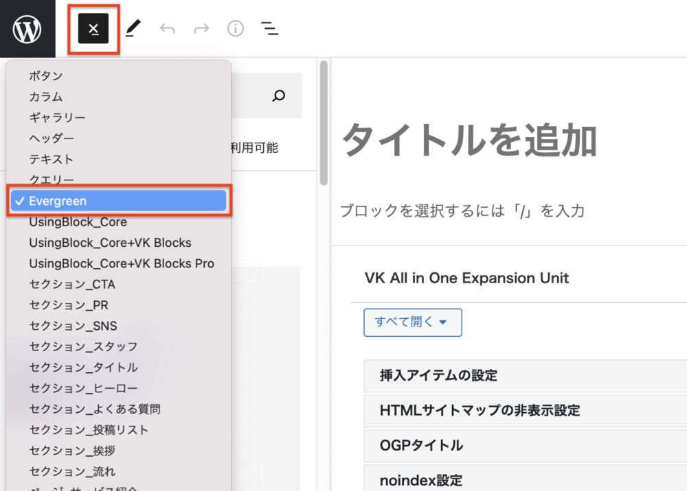 Evergreenを選択すると、Evergreenスキンに搭載されているブロックパターンがいくつか出てきます。